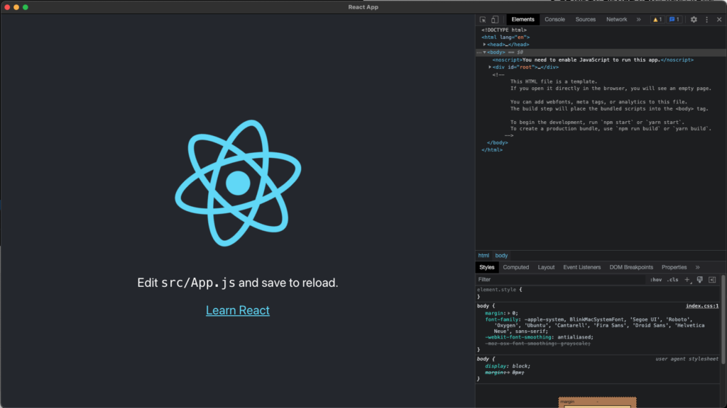 yarn add --dev electron실행 스크립트 추가 (package.json), 일렉트론 진입점 설정(src/StartUp.js)